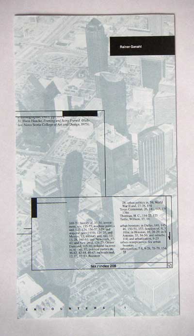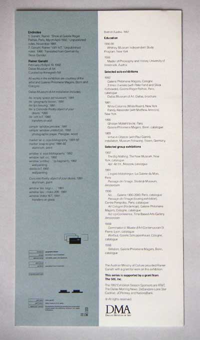 exhibition folder, Rainer Ganahl, 1991 Dallas Museum of Art, Dallas, order from Dallas Museum of Art. find on line. with Text by Ann Rorimer (no title) 1991 see her text and hte inside of hte folder with juxtaposed graphics of hte exhbition: see exhibtion