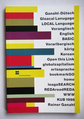 1998 Kunsthaus Bregenz, KUB, Bregenz. order from: infol@kunsthaus-bregenz.at Rainer Ganahl, Ganahl-Dütsch, Gloacal Lanugage, LOCAL Language ..., Kunsthaus Bregenz, Bregenz 1998 with texts by Rainer Ganahl and a conversation between Rainer Ganahl and Peter Weibel - see table of content above ISBN 3-85298-053-4 see exhibition